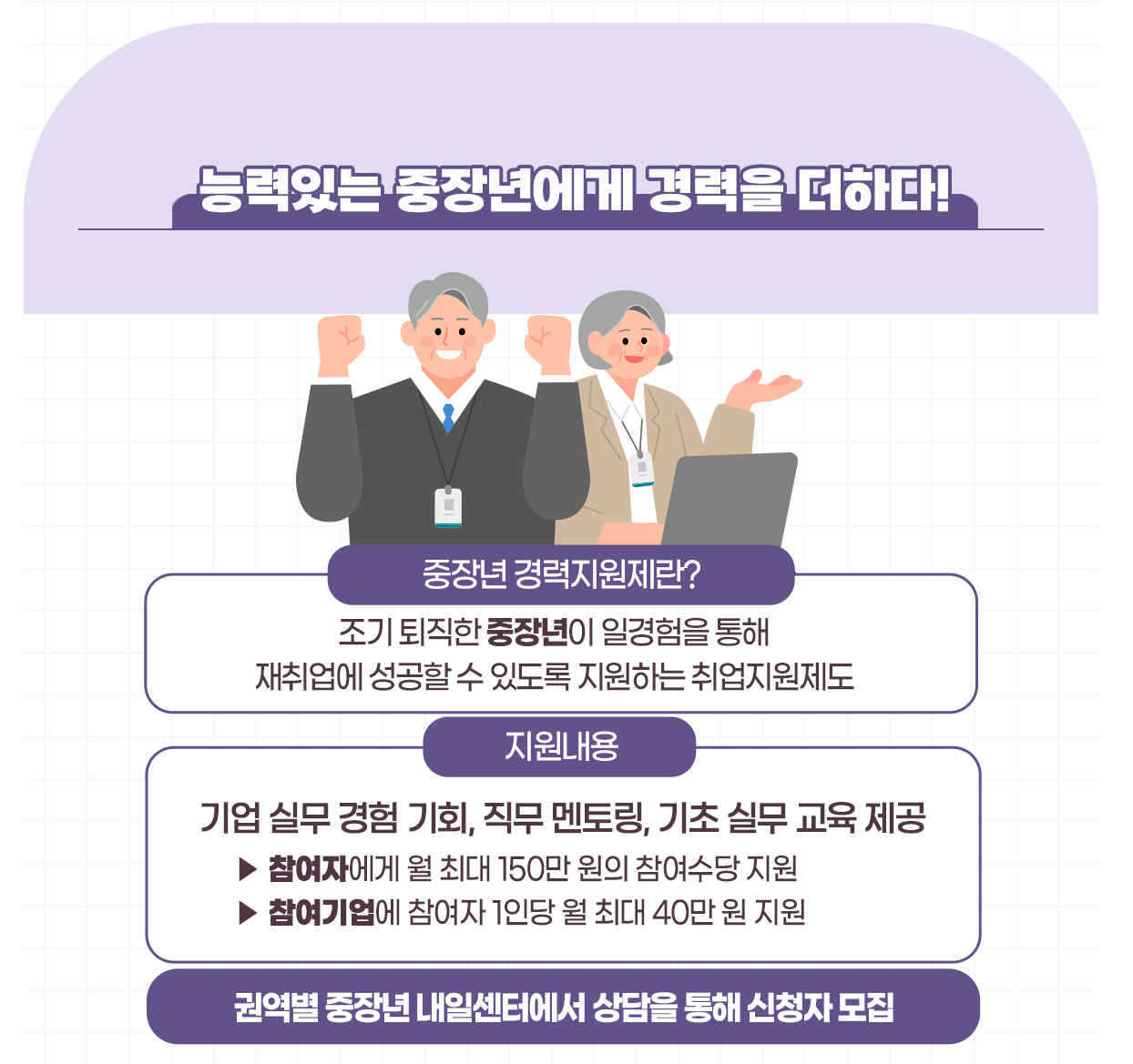 **"중장년 경력지원제"**는 재취업을 희망하는 중장년층이 실무 경험을 쌓고 성공적인 취업으로 연결될 수 있도록 지원하는 프로그램입니다.